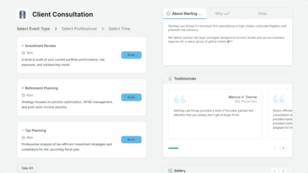 Consultants need more than availability sharing. They need a booking page that explains their offer, builds credibility, and makes clients more comfortable before the call.
