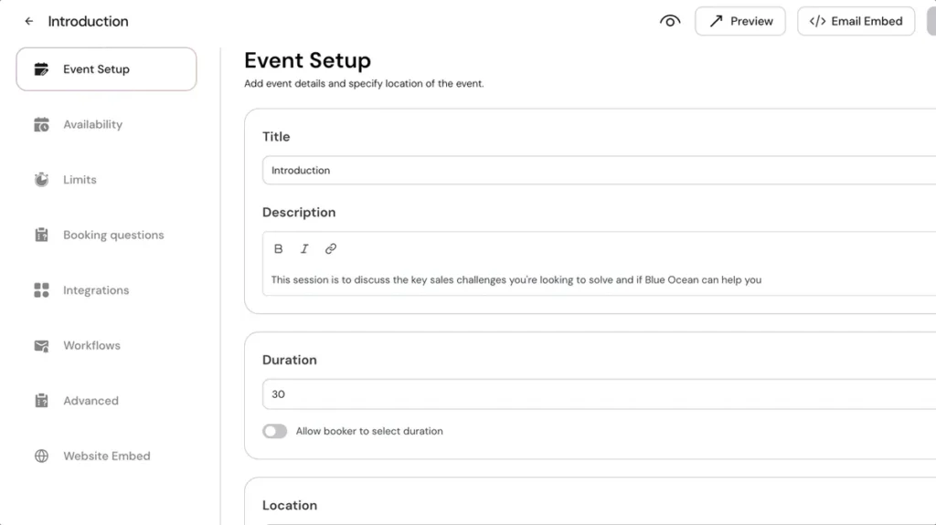 Lunacal can be embedded directly into your website, which is important for businesses that want a more seamless branded experience. Instead of redirecting visitors to a generic third-party page, you can keep the booking flow on your own site.